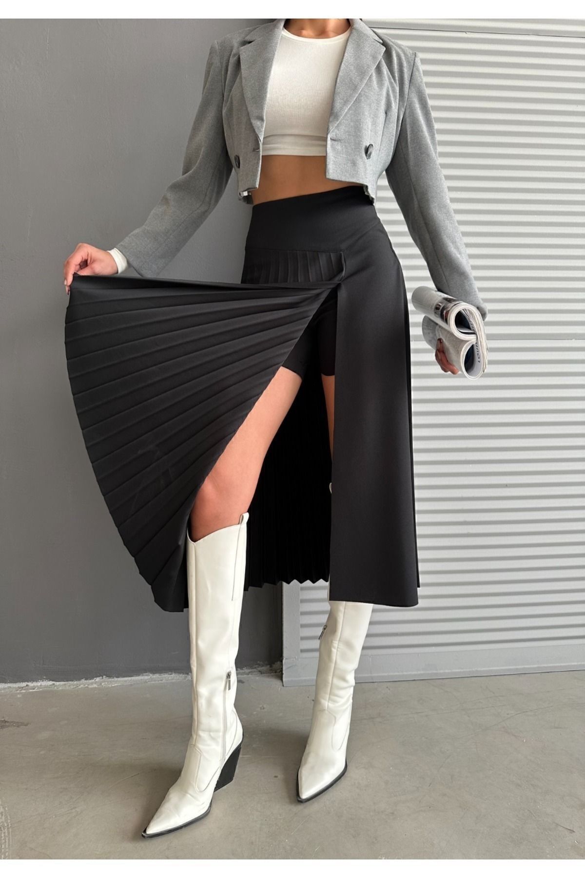 Siyah Yarı Piliseli Midi Boy Içi Şort Yırtmaç Detaylı Etek (BİR BEDEN BÜYÜK ALINIZ)