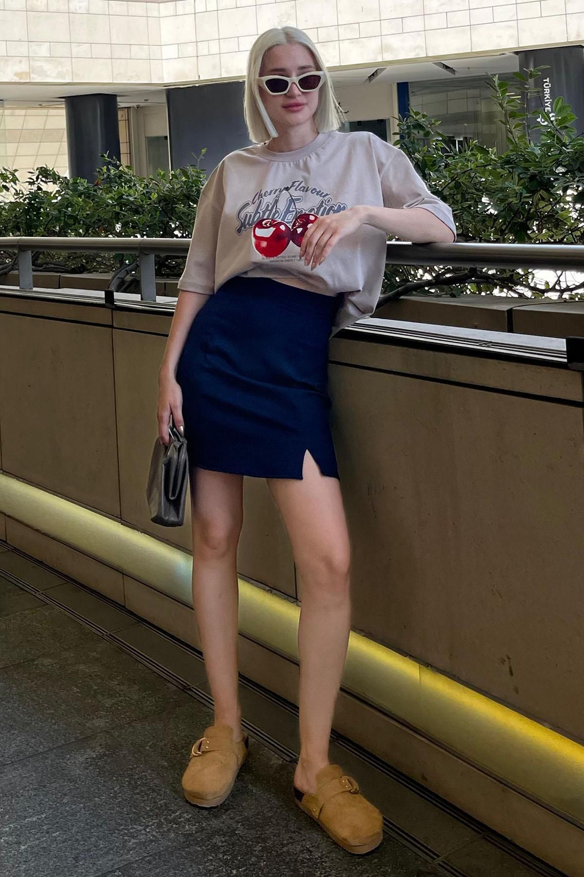 Lacivert Yüksek Bel Önden Yırtmaçlı Kısa Etek MG2086