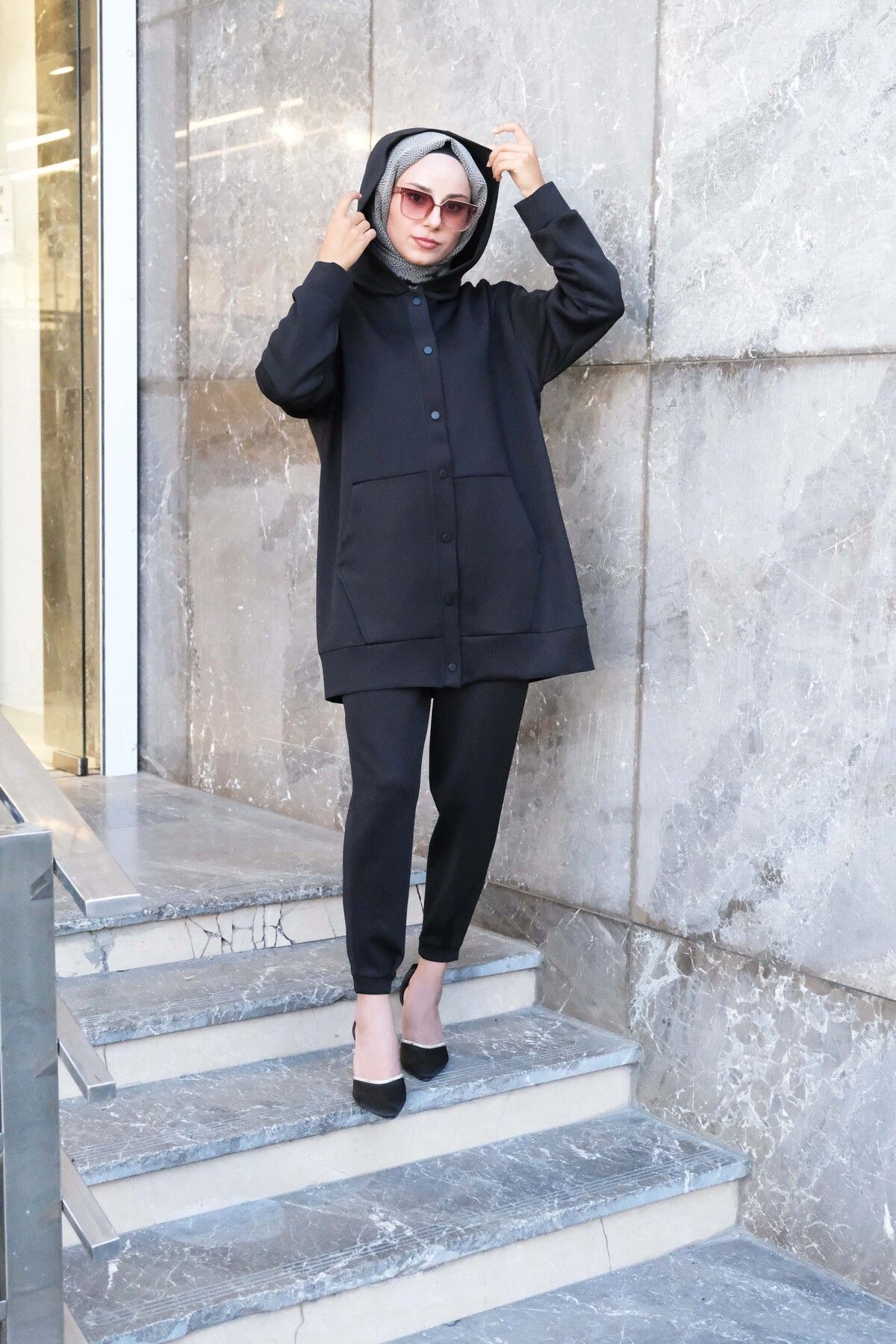 Özel Kumaş Scuba Takım Çıt Çıtlı Kapüşonlu Çift Cepli Salaş Stil Ütü Gerektirmez Giy-çık