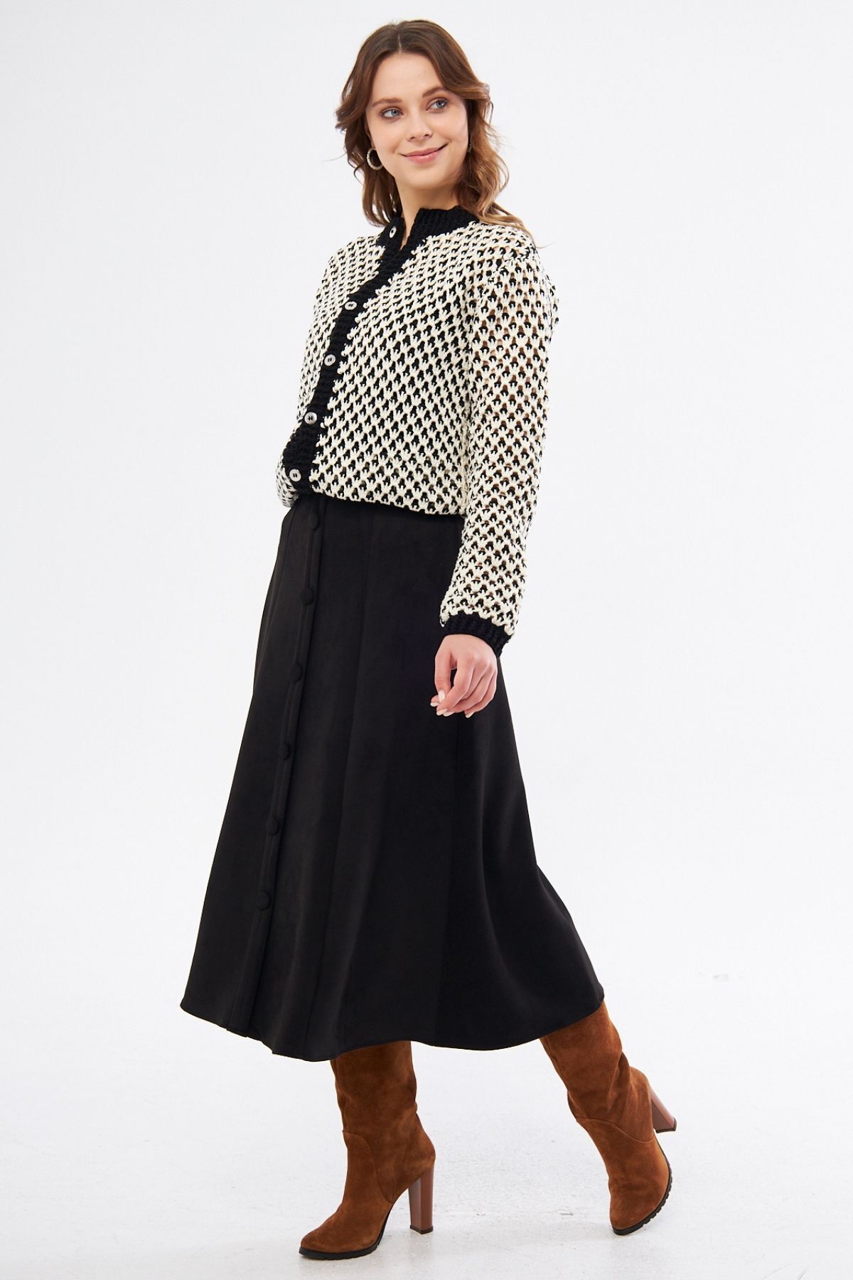 Siyah Süs Düğmeli Esnek Scuba Süet Midi Boy Etek