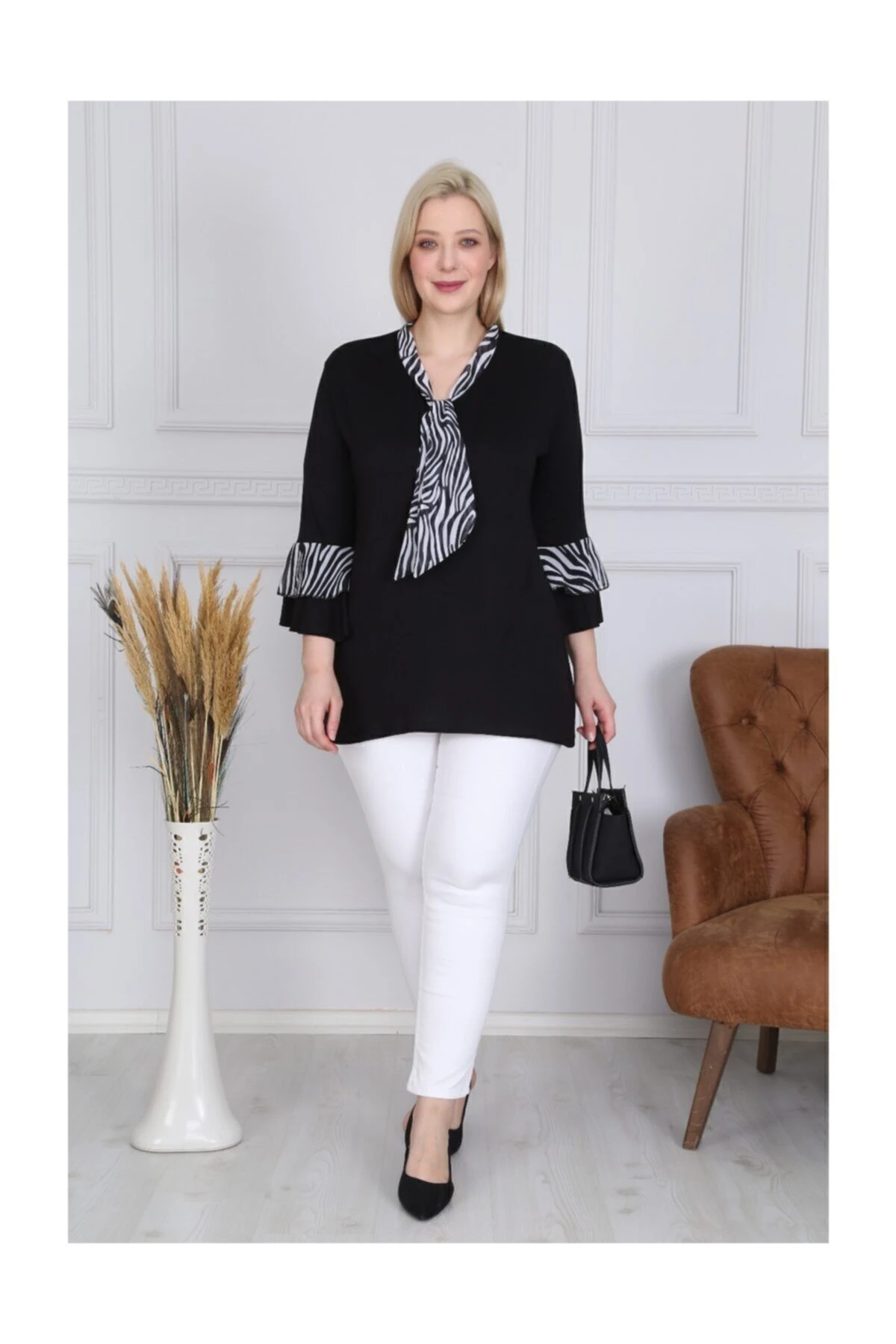 Siyah Zebra Şifon Flarlı Volankol Bluz